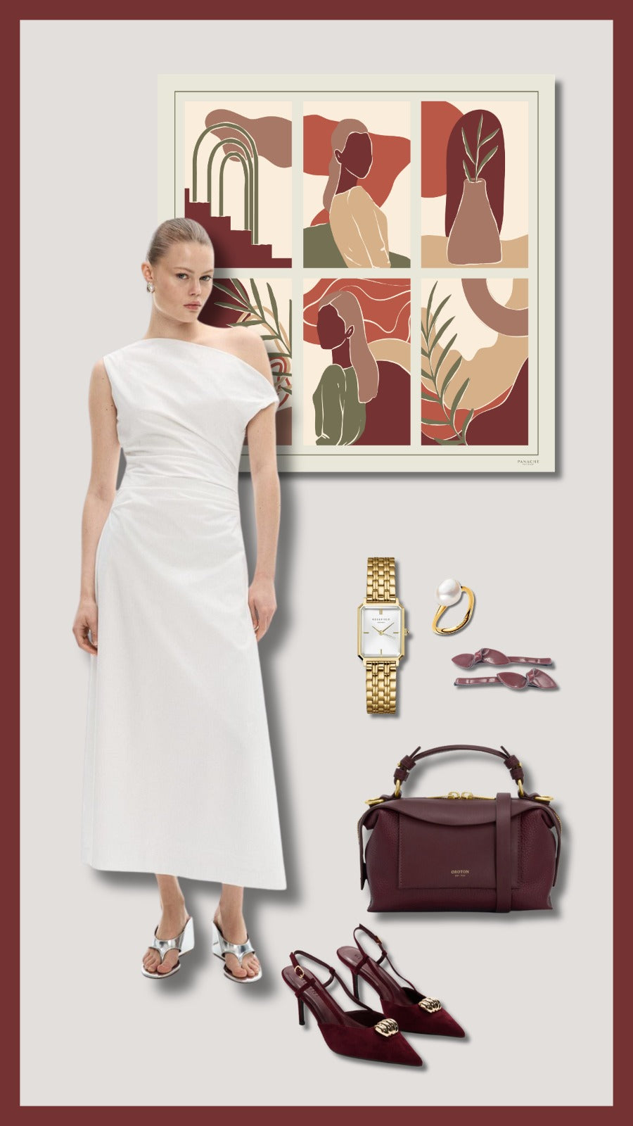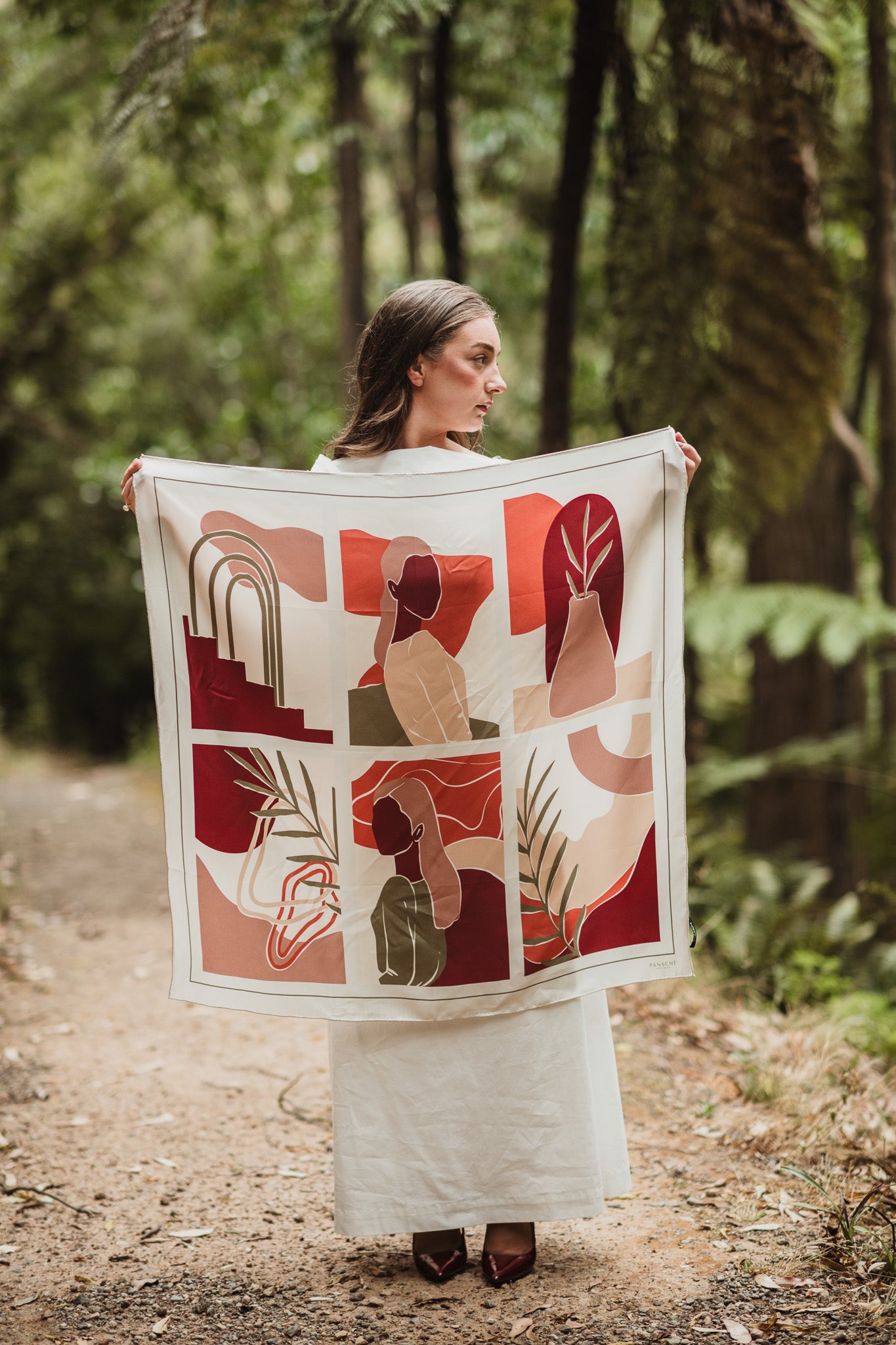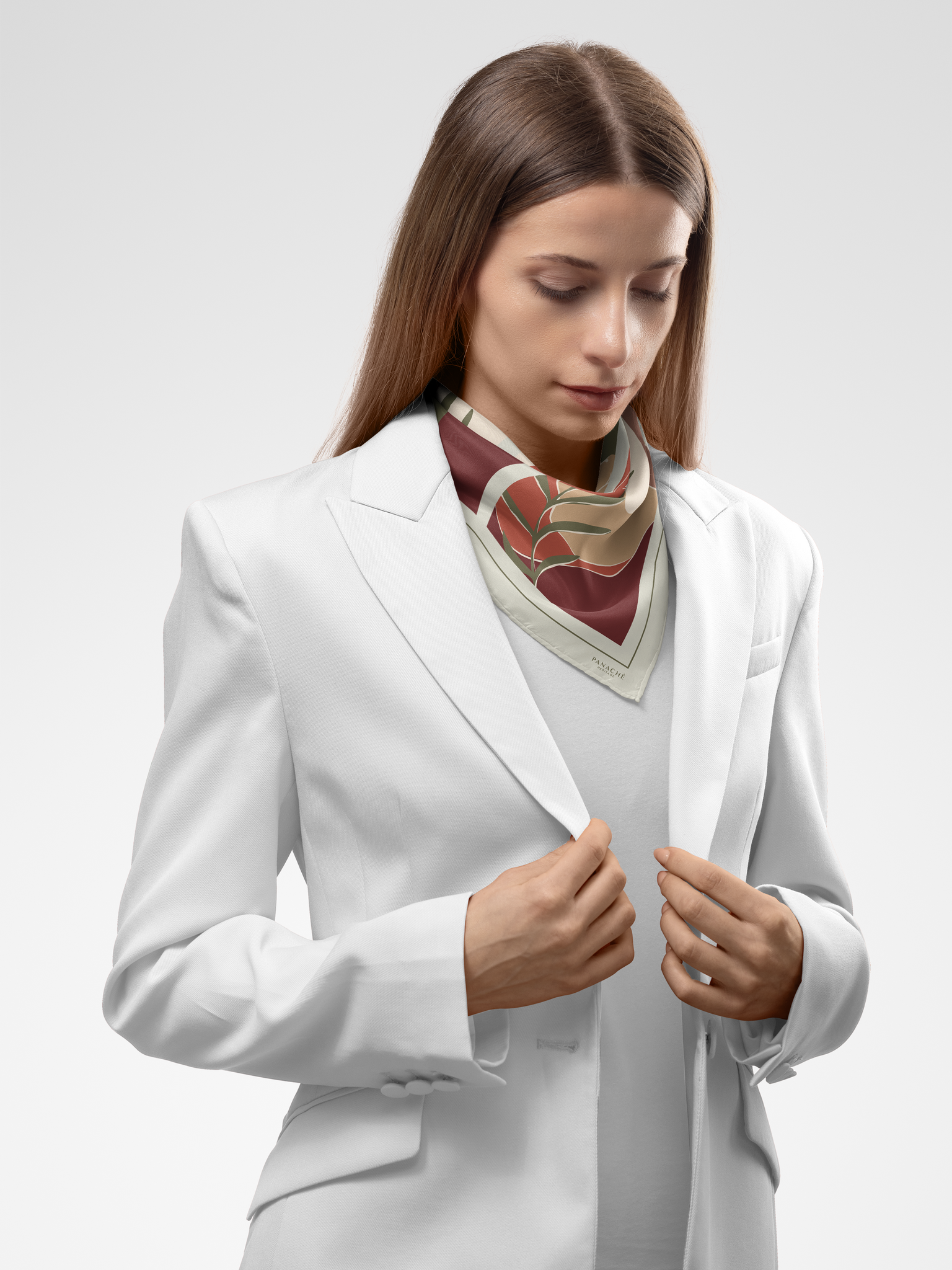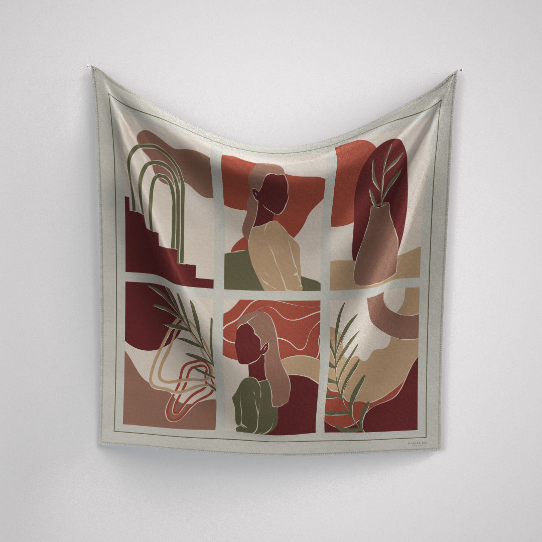 The Nayeli scarf features a sophisticated 90 x 90 cm square design, crafted from 16mm silk twill. Its olive tan, wine, and cream colors provide versatility for various outfits. Silk twill is known for its durability and luxurious feel, making this scarf an elegant addition to any wardrobe.