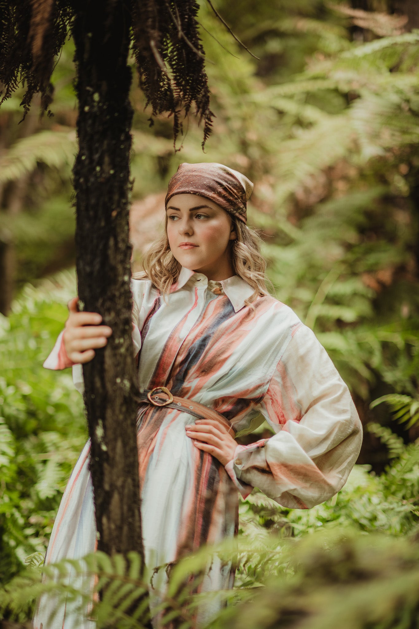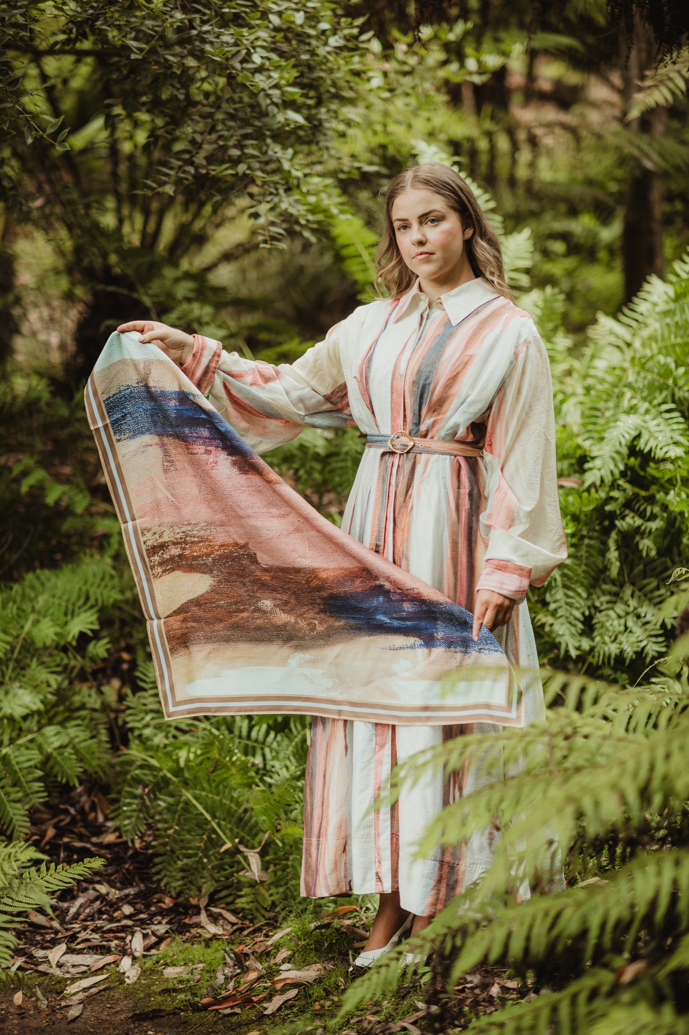 The Burnished Elements scarf features a 90 x 90 cm square design crafted from 16mm silk twill, showcasing earthy tones complemented by blue and beige accents. The hand-rolled hems enhance durability and provide a refined finish, making it an elegant accessory suitable for various styling options.