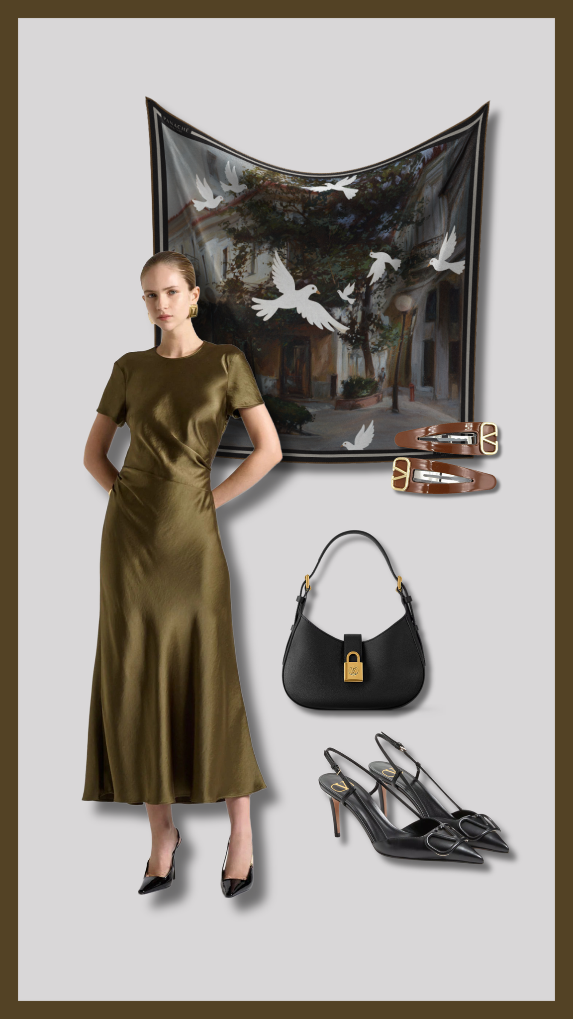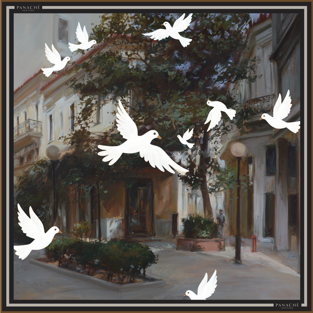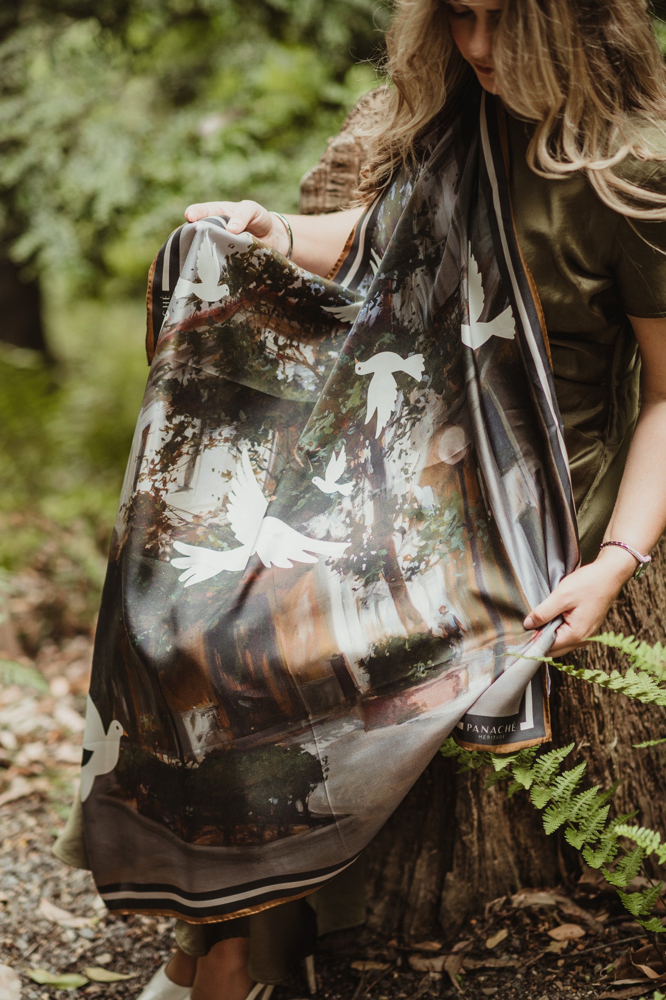 Wild Wings is a 90 x 90 square scarf crafted from 16mm silk twill, featuring a sophisticated palette of deep olive, tan, and black tones. The luxurious silk not only enhances visual appeal but also provides a soft, lightweight feel against the skin, making it suitable for various styling options and climates.
