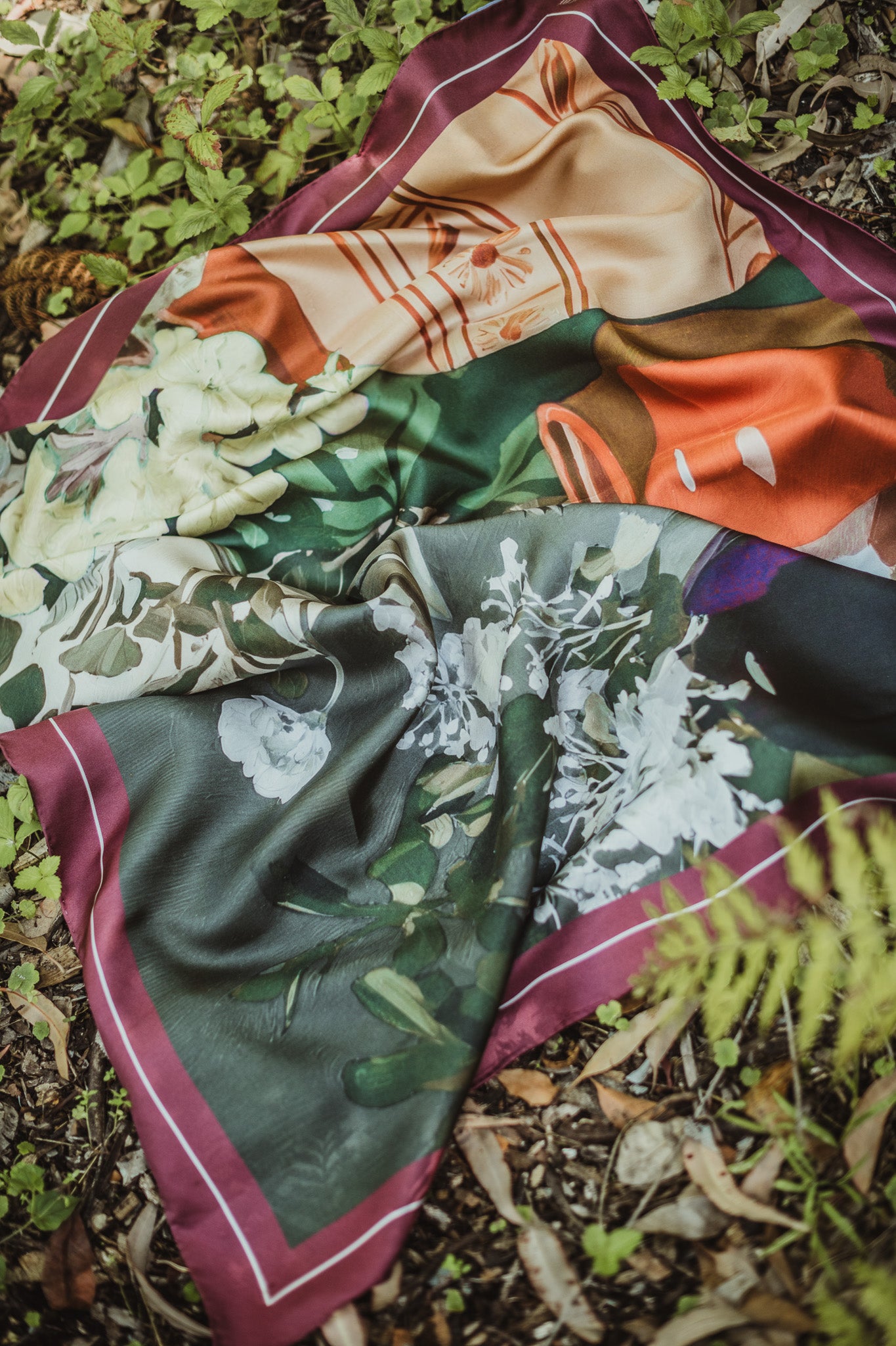 Kahu Bloom features earthen vessels that hold a selection of wildflowers, complemented by a color palette of olive and wine. Crafted from 16mm silk twill, this piece measures 90 x 90 cm, offering a luxurious texture and visual appeal that enhances various decor styles while promoting a natural aesthetic.