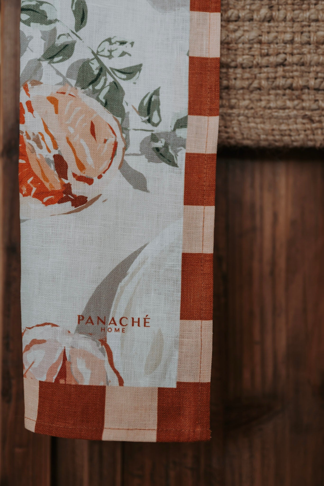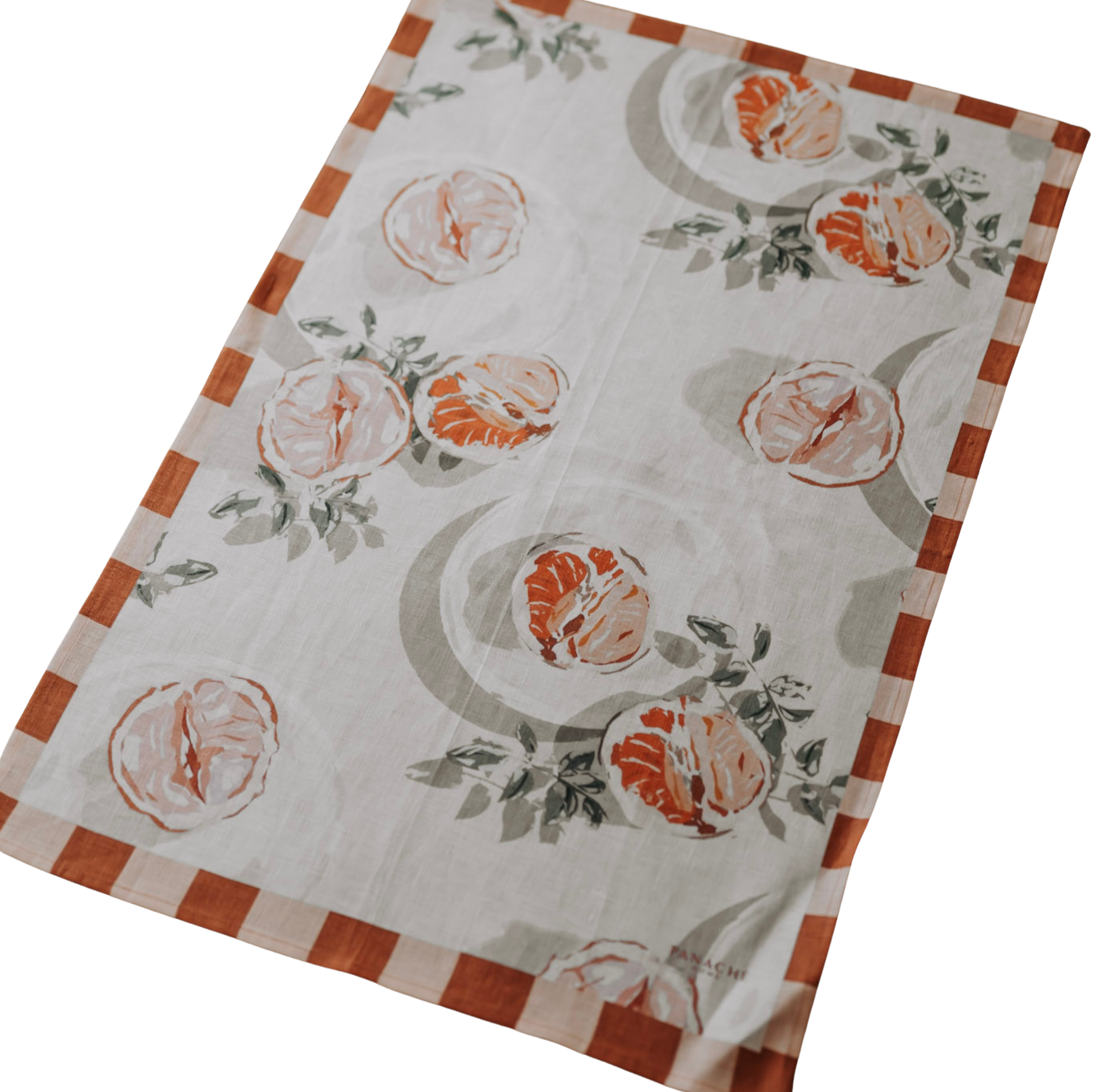 The No.3 Orange Blossoms tea towel is crafted from 100% linen, measuring 70 cm x 45 cm. Its hand-painted summer orange blossom design, combined with a peach and rust border, enhances both functionality and aesthetic appeal, making it an ideal choice for summer picnics or as a thoughtful hostess gift.