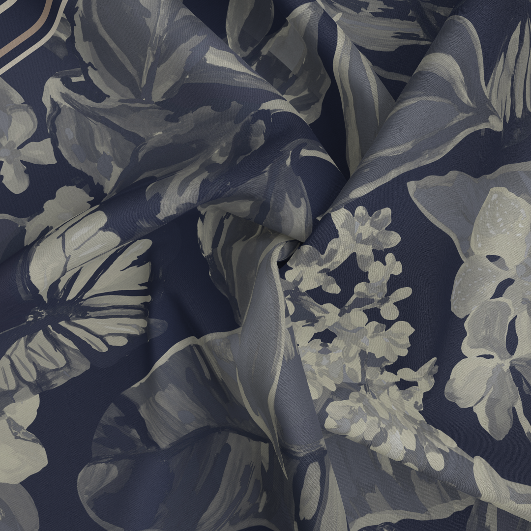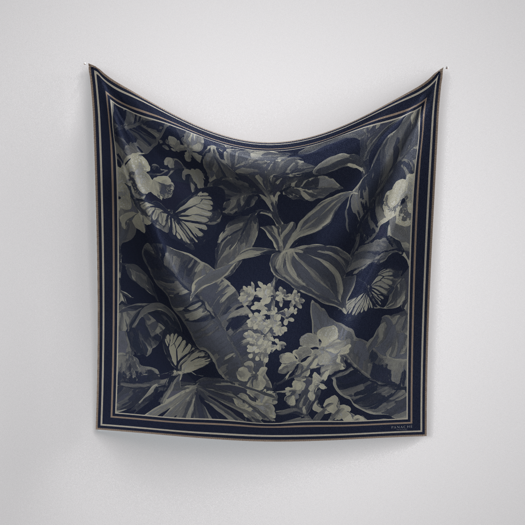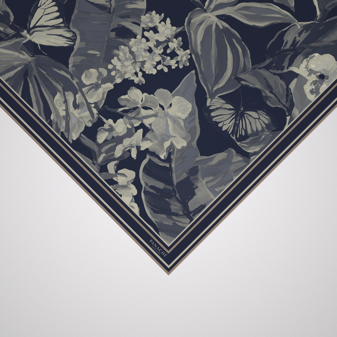 The Florida Navy silk square features a refined design with navy and tan tones, crafted from 16mm silk. Each piece measures 90 x 90 cm and is meticulously hand-rolled at the hems, ensuring durability and a polished finish. This accessory offers both elegance and versatility for various styling options.