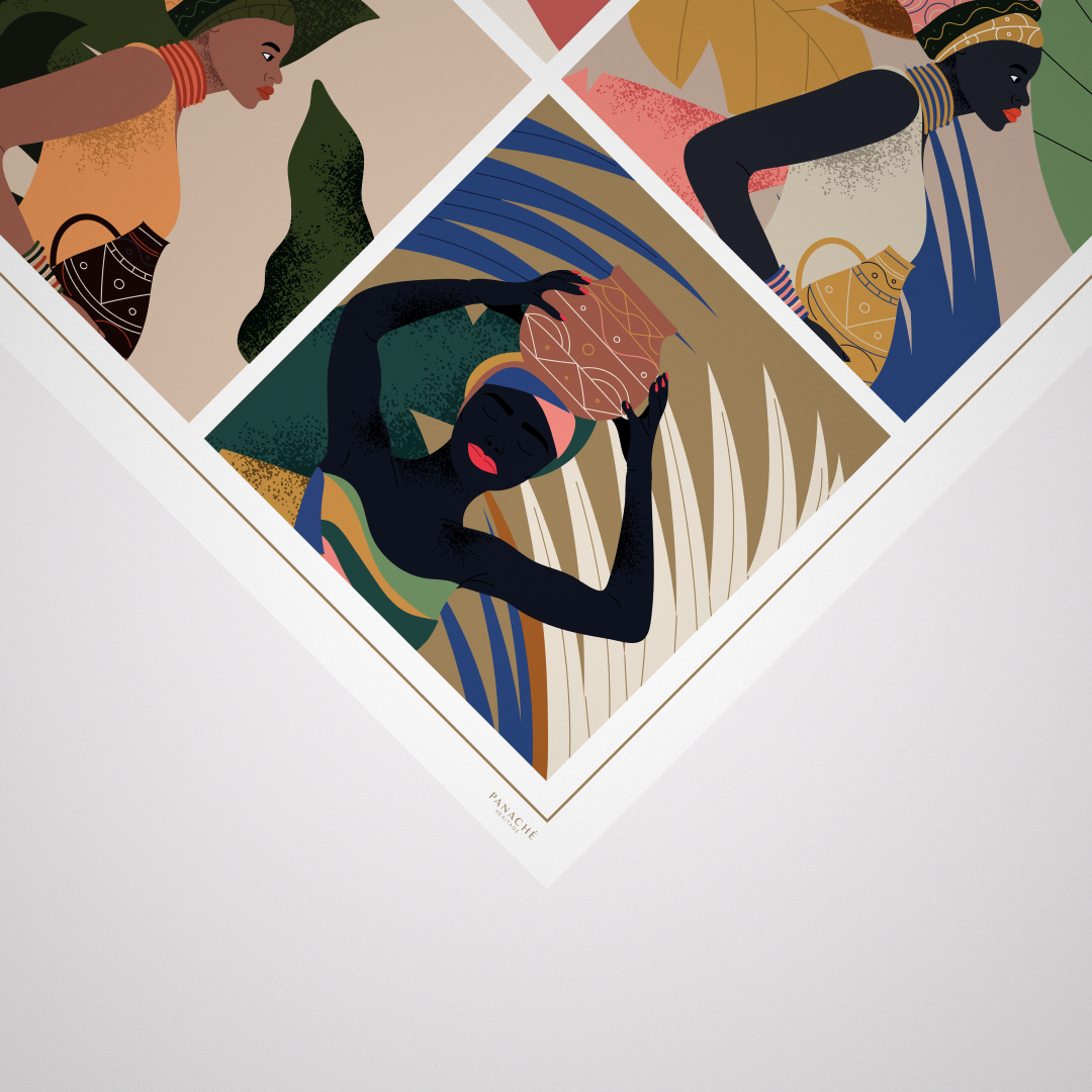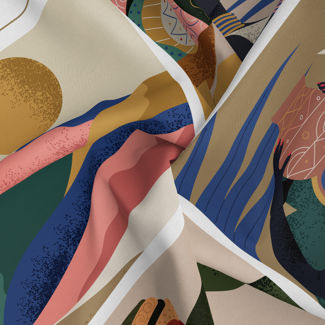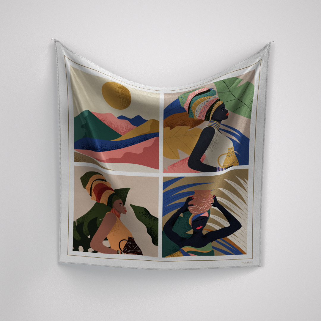 The Princess Wild scarf, measuring 90 x 90 cm and crafted from 16mm silk twill, features a hand-rolled hem for elegance and durability. Its tribal princess-inspired design combines a brown border with royal blue, peach, and olive colors, making it a versatile accessory that enhances a variety of outfits while providing a luxurious feel.